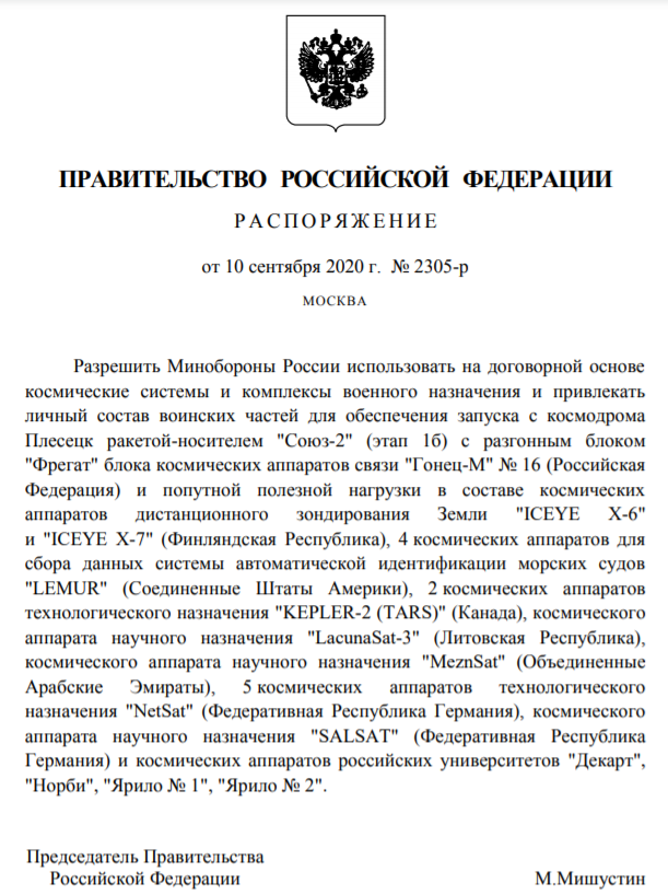 Для вывода на орбиту блока космических аппаратов "Гонец-М" будет использоваться военная инфраструктура, пишет "РИА Новости". Соответствущее распоряжение подписал премьер-министр РФ Михаил Мишустин.