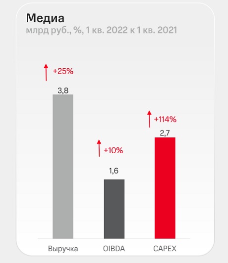 Показатель скорректированного операционного дохода до вычета амортизации основных средств и нематериальных активов (OIBDA) направления медиа показал рост в 10% год к году, до 1,6 млрд рублей. Капитальные расходы в первом квартале увеличились на 114% за счёт приобретения физических активов. Они достигли 2,7 млрд рублей.