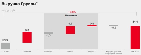 В то же время выручка всей компании показала рост на 8,5% по сравнению с аналогичным периодои 2021 года и составила 134,4 млрд рублей. В компании объяснили данный результат ростом потребления сервисов экосистемных направлений , в частности — финтех и медиа.