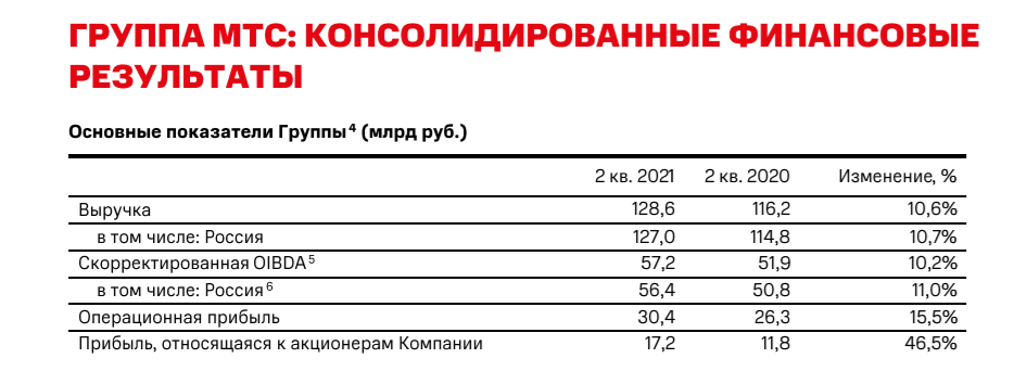 Чистая прибыль Группы во втором квартале 2021 года увеличилась на 46,5% по сравнению с аналогичным периодом прошлого года до 17,2 млрд рублей. Существенный вклад в рост данного показателя внес МТС Банк. В первом полугодии 2021 года чистый процентный доход МТС Банка увеличился на 22,1 процента, а чистый комиссионный доход вырос на 123,6% в годовом исчислении. Чистая прибыль МТС Банка за первые шесть месяцев 2021 года составила 3,4 млрд рублей.