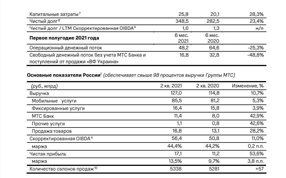 Свободный денежный поток Группы без учета МТС-Банка за шесть месяцев, закончившихся 30 июня 2021 года, снизился в годовом исчислении до 16,8 млрд рублей с 32,8 млрд рублей, что отражает более высокие капитальные затраты и повышение активности компании в области слияний и поглощений в первом полугодии 2021 года по сравнению с аналогичным периодом прошлого года, а также высокую базу в первом полугодии 2020 года — за счет поступлений от продажи ассоциированных компаний.