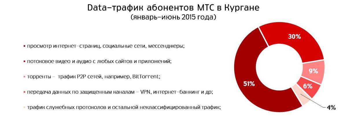 При работе в сети с помощью мобильных устройств жители Курганской области предпочитают общение в социальных сетях и мессенджерах, а также интернет-серфинг — на эти занятия в первом полугодии 2015 года пришлось больше половины трафика (51%). Не менее популярными стали прослушивание музыки, просмотр видео онлайн и его последующая загрузка для просмотра офлайн — на эти цели пришлось 30% от общего объема информации. Завершают рейтинг популярных онлайн-действий загрузка торрентов и передача данных по защищенным каналам — 9% и 6% соответственно.