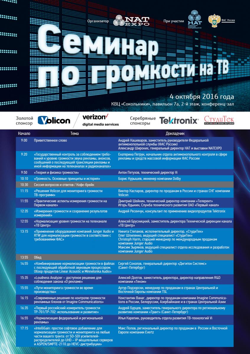 В первой половине семинара выступят представители ФАС России, инженеры Vi и Dolby Laboratories, которые расскажут о теории и практике регулирования громкости рекламы в современном мировом и российском ТВ. Свое участие в семинаре подтвердил заместитель руководителя ФАС России Андрей Кашеваров, начальник отдела антимонопольного контроля в сфере рекламы и средств массовой информации ФАС России Екатерина Петрук. Также с презентациями выступят представители Первого канала и канала "ТВ Центр".