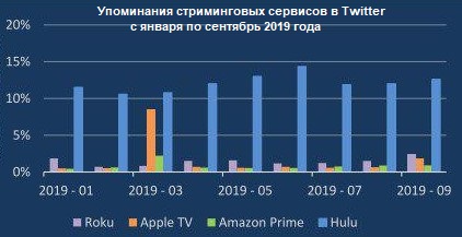 Eagle Alpha проанализировала 32 млн упоминаний стриминговых сервисов в Twitter, и выявила, что Netflix продолжает доминировать в беседах пользователей с долей более 80%. В то же время стриминговые сервисы Apple TV+, Roku и Amazon Prime продолжают оставаться с менее чем 5% упоминаний каждый.