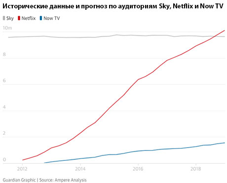Стоит отметить, что компания Sky не проигнорировала бум цифрового стриминга в Великобритании. В 2012 году - тогда же, когда в стране запустился Netflix, - заработал ее сервис Now TV. На конец 2018 года у него ожидается около 1,5 млн подписчиков. Он стал третьим по популярности сервисом такого рода в Соединенном Королевстве, также пропустив вперед Prime Video от Amazon. Now TV примечателен тем, что, в отличие от Sky с классической моделью платного ТВ, предлагает возможность купить просмотр в течение дня, недели или месяца без необходимости полной подписки. Чтобы обойти Sky и Now TV по суммарному числе абонентов, Netflix потребуется год-два, отмечает Guardian.