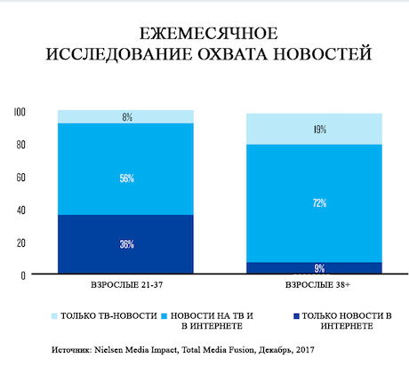 Только треть миллениалов выбирают чтение новостей исключительно в интернете, не потребляя при этом телевидение. Тем не менее, несмотря на такую популярность онлайна, Nielsen сделали вывод, что большой охват не предполагает полную вовлеченность – в онлайне люди чаще просто просматривают заголовки, тогда как по ТВ они смотрят сюжет целиком.