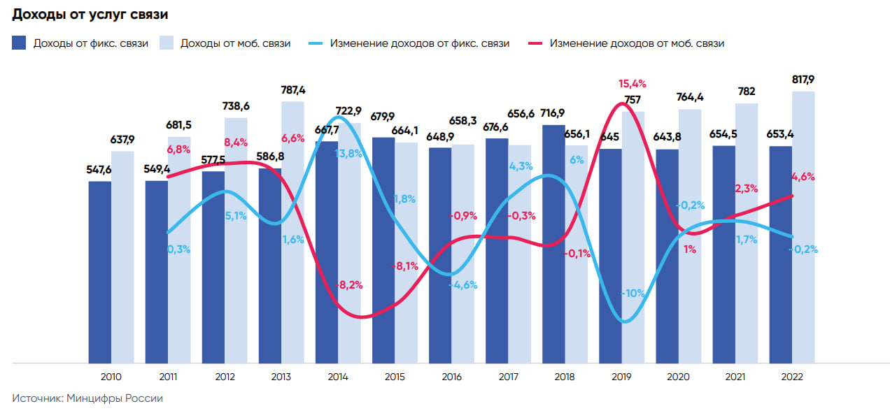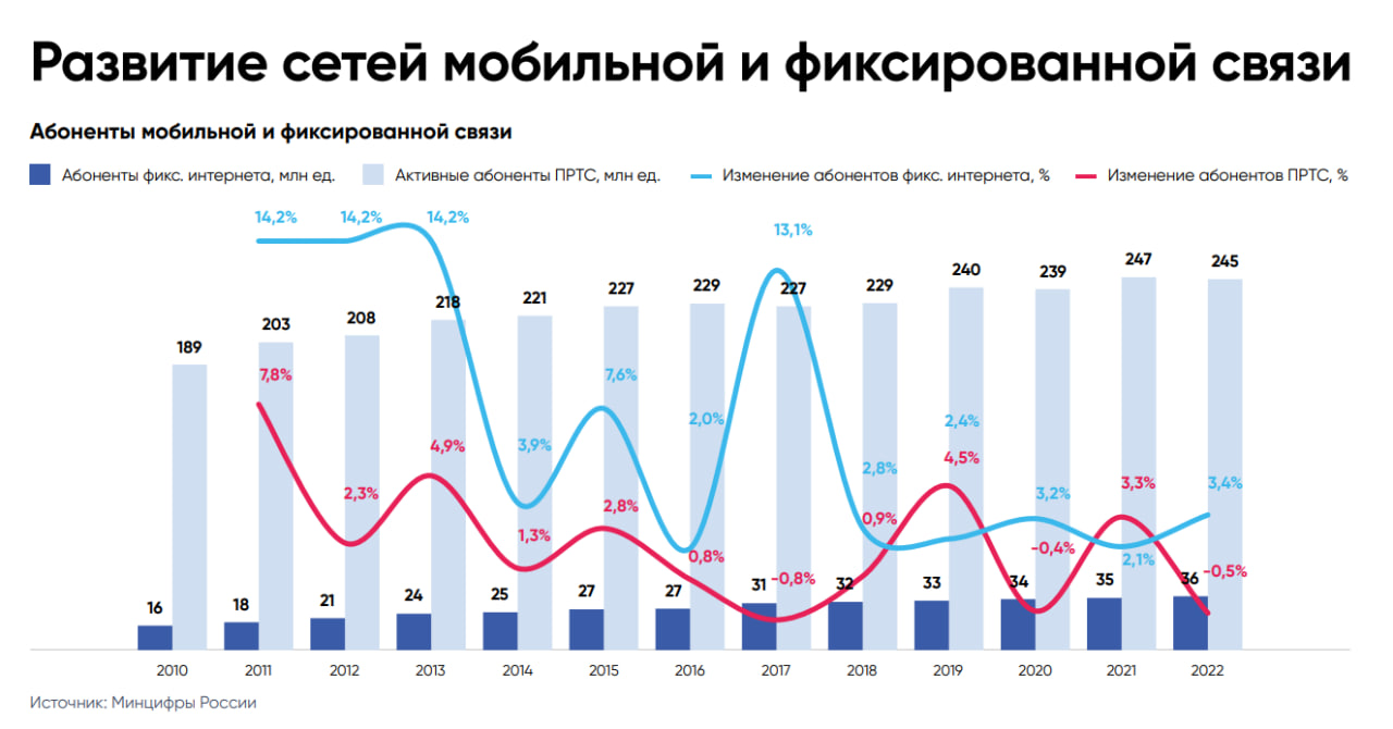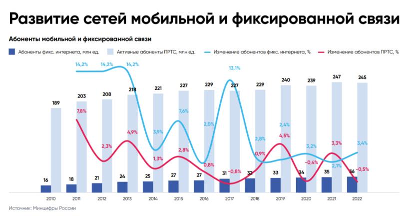 Также в отчете приводится количество абонентов мобильной и фиксированной связи, при этом последние данные приводятся за 2022 год. Так, число активных абонентов подвижной радиотелефонной связи сократилось на 0,5% — с 247 млн в 2021 году до 245 млн в 2022 году.
