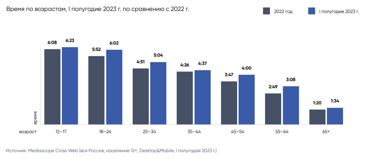 Аудитория интернета в России насчитывает порядка 103 млн человек, что составляет 85% от всех жителей страны. Среднее время, проводимое в интернете ежедневно, увеличилось на 18% по сравнению с 2022 годом — до 4 ч. 43 м. Из них две трети тратится на поиск информации, общение, развлечение и совершение покупок. Причем 93% времени в интернете пользователи проводят с мобильных устройств.