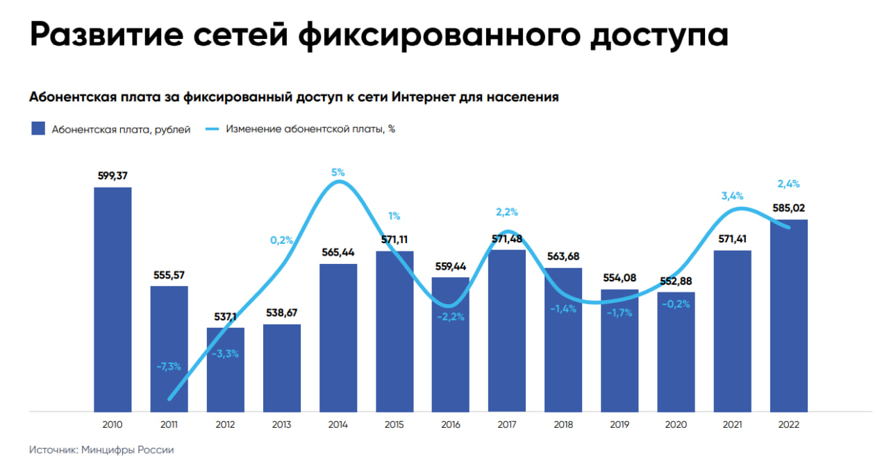 Согласно отчету, доля домохозяйств с доступом к широкополосному интернету составила 86,4% в 2023 году. Ожидается, что к 2030 году она достигнет 97%. В числовом выражении число абонентов фиксированного интернета увеличилось до 36 млн в 2022 году (+3,4% по отношению к 2021 году). Отмечается, что в среднем абонентская плата за фиксированный доступ в интернет составляет 585,02 рублей. Это на 2,4% больше, чем в 2022 году.