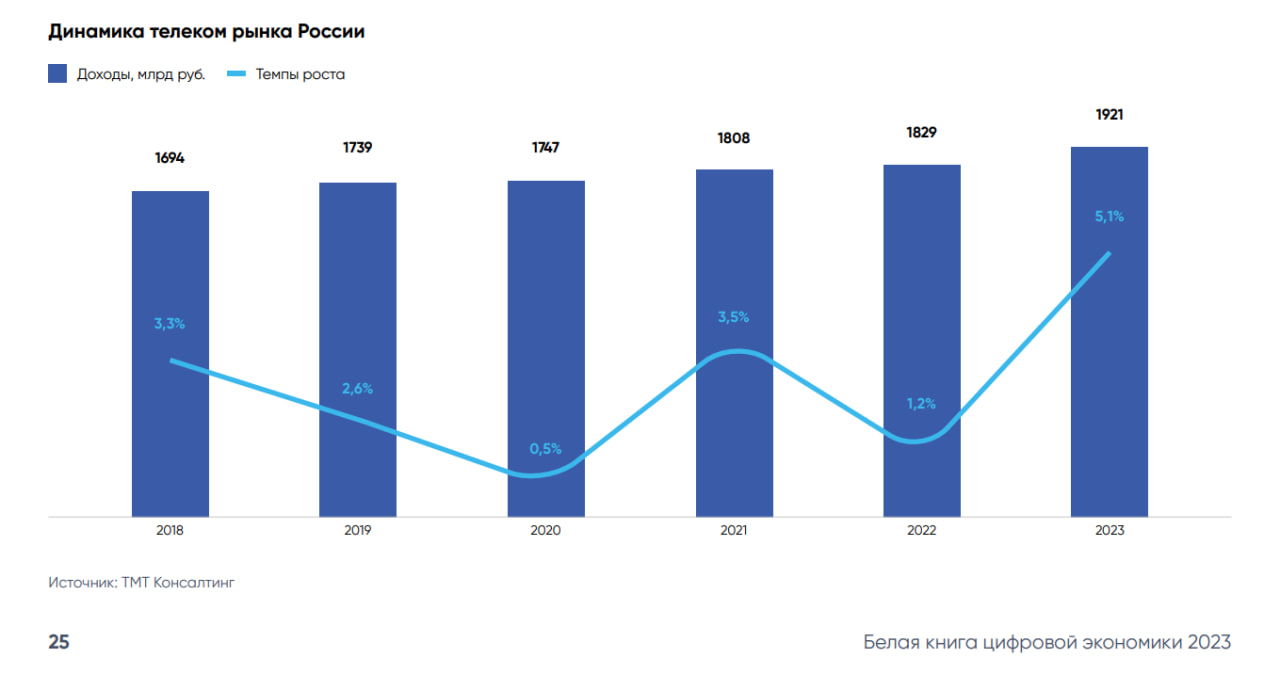 Российский телеком-рынок в денежном выражении достиг более 1,9 трлн рублей в 2023 году. Таким образом, он увеличился на 5,1% по сравнению с 2022 годом, что стало самой высокой динамикой роста за последние шесть лет. Такие данные приводятся в исследовании АНО "Цифровая экономика" — "Белая книга цифровой экономики".