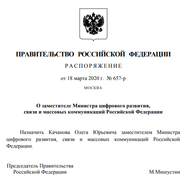 Директор департамента проектов цифровой трансформации Минкомсвязи Олег Качанов назначен новым заместителем министра связи, сообщает ТАСС. Соответствующее распоряжение подписал премьер-министр РФ Михаил Мишустин.