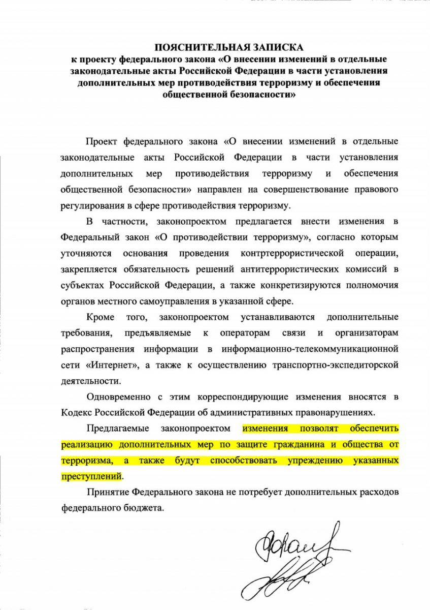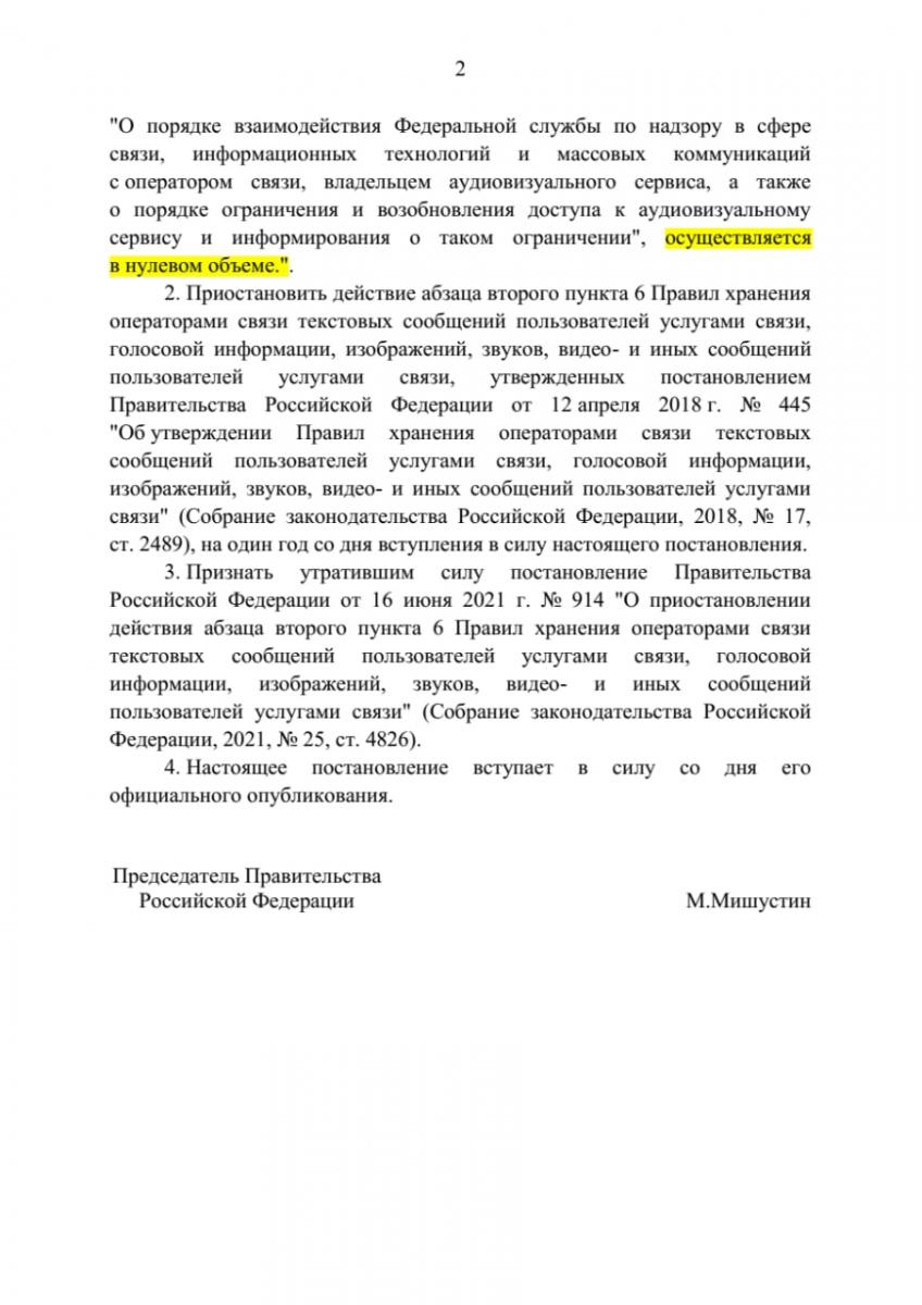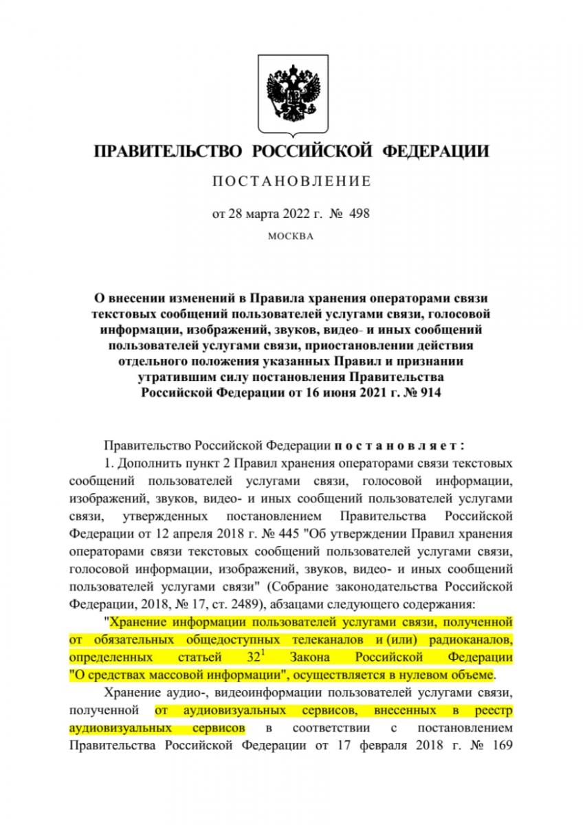 Постановлением от 28 марта 2022 года №498 из общего объёма текстовой, голосовой и аудиовизуальной информации пользователей, который операторы связи обязаны хранить в соответствии с пакетом антитеррористических законов, исключён трафик общедоступных теле- и радиоканалов, а также стриминговых сервисов. Соответствующий документ подписал Председатель Правительства Михаил Мишустин, сообщает пресс-служба правительства России.