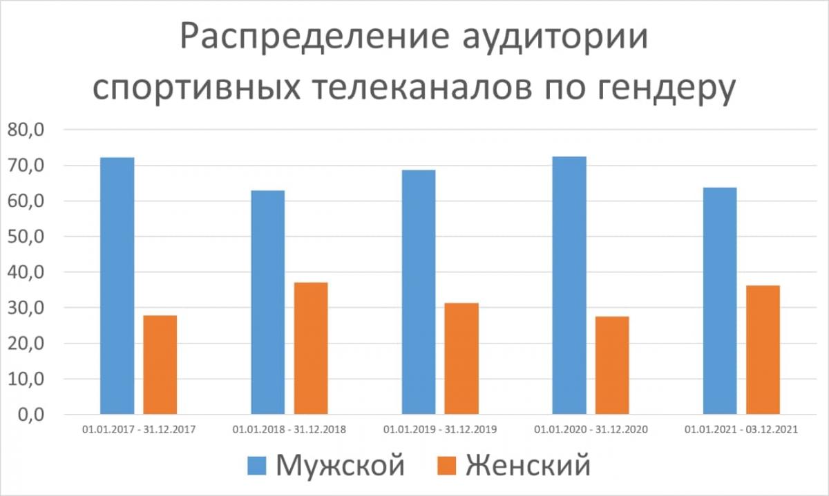 В России ситуация обстоит несколько иначе, хотя и не противоречит приведенным данным. К примеру, среди показателей панелей TV Index и TV Index Plus компании Mediascope есть и демографические, в том числе раскладка по аудитории спортивных телеканалов. Там можно увидеть, что доля женской аудитории спорта, действительно, периодически увеличивалась в последние годы. Правда, есть основания полагать, что эти изменения были связаны с крупными сезонными спортивными событиями – Чемпионатом мира-2018 и Чемпионатом Европы-2020 по футболу (который проходил в 2021 году), а также Олимпийскими играми 2020 (которые тоже состоялись в 2021 году).