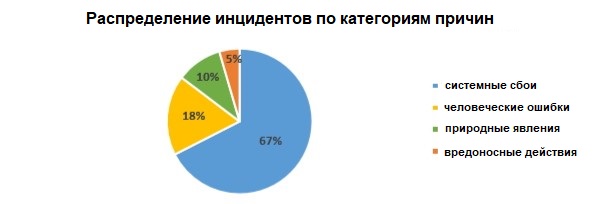 Системные сбои стали наиболее частыми инцидентами в 2018 году - 67% всех инцидентов пришлось на эту категорию, что, как отмечают авторы отчета, согласуется с данными предыдущих лет. Самые частые системные сбои - отказы оборудования и программные ошибки.