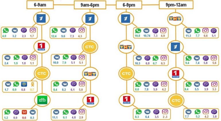 Исследовательский холдинг "Ромир" рассмотрел особенности потребления ТВ россиянами при использовании так называемого второго экрана, когда зритель, помимо экрана телевизора, параллельно использует другие устройства. Как выяснилось в процессе исследований, при просмотре любых каналов в любое время суток зрители неизбежно отвлекались на телефонные звонки, мессенджеры, социальные сети и почтовые программы на смартфонах и планшетах, говорится в сообщении "Ромира".