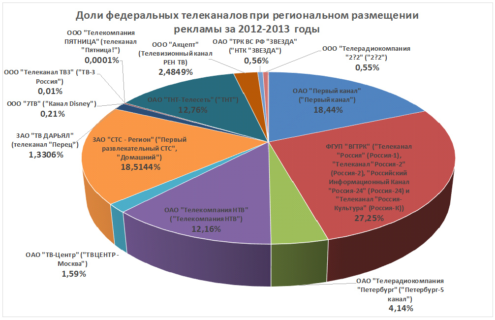 По подсчетам Федеральной антимонопольной службы доли федеральных телеканалов на рекламном рынке (учитывая как национальное, так и региональное размещение) по итогам 2013 года снизились, — об этом сообщает "Коммерсант". Согласно данным ФАС, совокупная доля "Первого канала", ВГТРК и НТВ составила 49,28% по итогам 2012-2013 годов против 52,39% по итогам 2011-2012 годов.