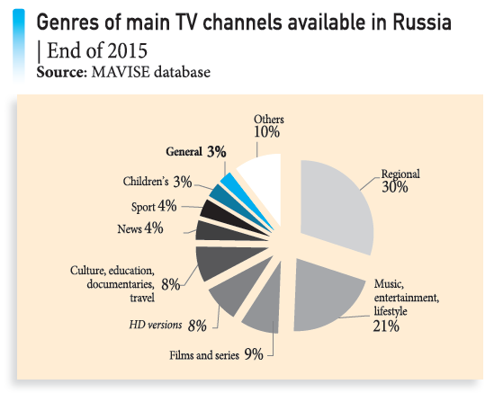 В этой связи в более детальной аналитике они решили рассматривать только 739 телеканалов, которые функционировали и были доступны на конец 2015 года отечественным зрителям. Надо сказать, что в число "избранных" не включили телекомпании-региональных партнеров, коих за отчетный период насчитывалось не менее 520. Такие региональные телекомпании по классификации ЕАО называются "каналами-окнами", поскольку вставляют передачи в сетку вещания своего федерального партнера. "При этом в России именно они, как правило, являются обладателями лицензии на эфирное вещание в регионе, но не имеют достаточно контента для заполнения эфира в течение 24-х часов", — отмечают аналитики.