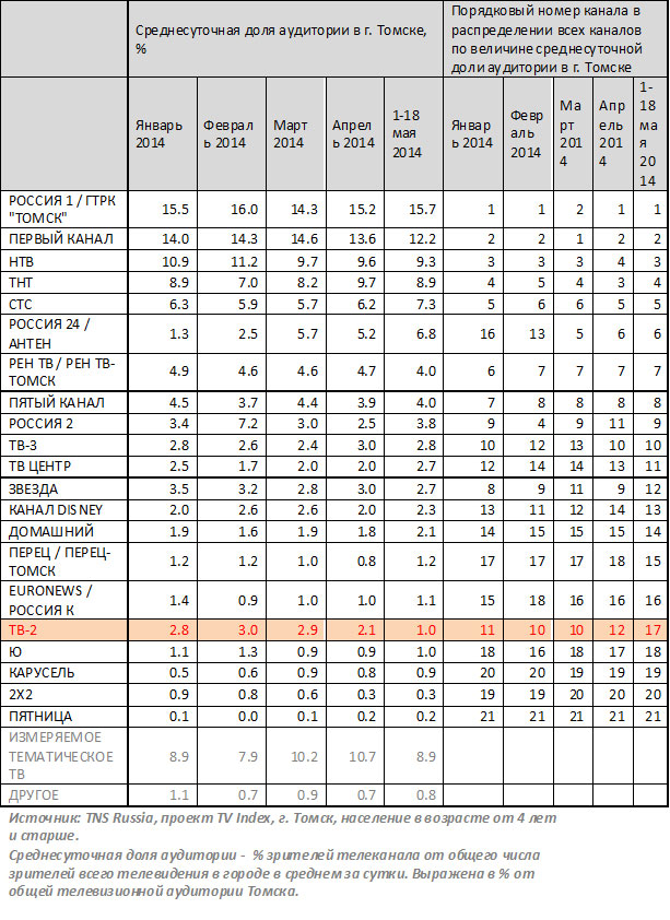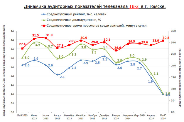 "Среднесуточная доля аудитории и рейтинги ТВ-2, как производные от охвата и времени просмотра показатели, заметно падают. Если в течение последнего года среднесуточная доля аудитории канала колебалась в районе 2,5-3%, то за 1-18 мая она составила лишь 1%. В результате вещатель стал существенно проигрывать своим конкурентам. Если в январе ТВ-2 занимал в Томске 12-е место по доле аудитории, то в первой половине мая — лишь 17-е", — прокомментировала Мария.