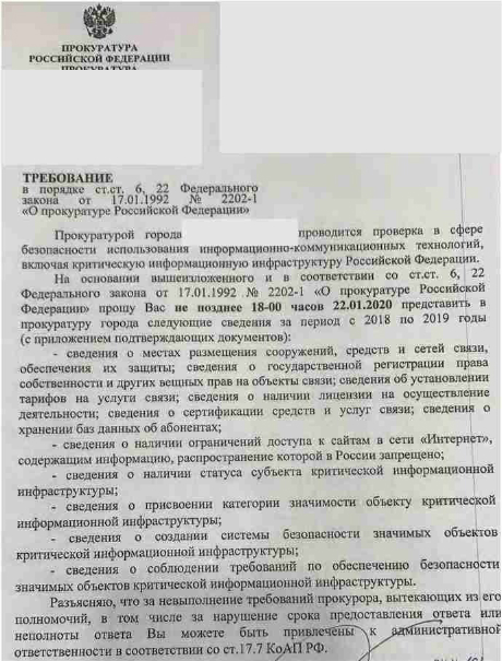 За последние пару дней "Ростелесеть" зафиксировала не менее десяти обращений от прокуратуры к операторам связи в разных регионах. В своих запросах прокуратура сообщает, что проводит проверку в сфере безопасности использования информационно-коммуникационных технологий, включая критическую информационную инфраструктуру Российской Федерации. Требование к операторам сводится к предоставлению в двухдневный срок сведений за период 2018-2019 года с приложением следующих документов: