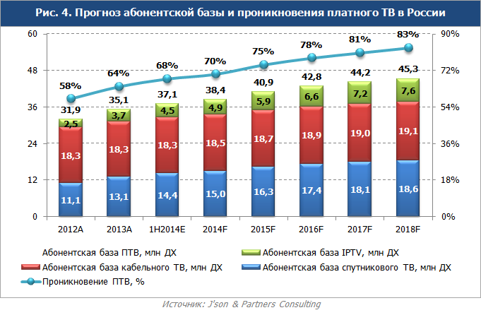 В целом российский рынок платного ТВ является одним из самых крупных в мире: по итогам первого полугодия 2014 года он насчитывает 37,1 млн домохозяйств при проникновении услуги на уровне 68%. Для сравнения, например, в США абонентская база платного телевидения составляет 100 млн домохозяйств при проникновении услуги на уровне 84%. По мнению J’son & Partners Consulting, рост абонентской базы платного телевидения в России продолжится, к 2018 году количество абонентов увеличится до 45,3 млн домохозяйств, а проникновение услуги платного телевидения достигнет 83%.