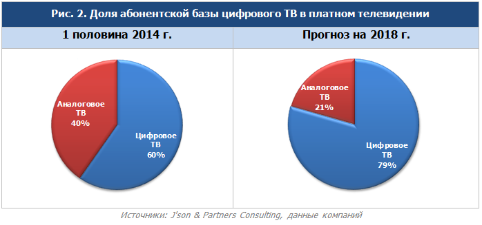По оценкам исследователей, доля абонентов цифрового ТВ в общей абонентской базе платного телевидения к середине 2014 года составляла 60%, а к концу 2018 года должна увеличиться до 79%.