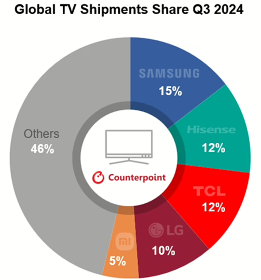 Среди компаний-поставщиков по-прежнему лидирует Samsung, занимающий сейчас 15% мирового рынка (в прошлом квартале показатель был выше). Стремительно набирают обороты китайские бренды: Hisense вернула себе второе место, поставив телевизоров на 19% больше, чем в III квартале 2023 года, а TCL прочно обосновалась на третьем месте. LG, занявшая четвертое место благодаря своей популярности в Европе, зафиксировала 7%-ный рост в годовом исчислении и вернула свою долю рынка в диапазоне 10%.