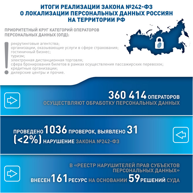 Что касается еще одного аспекта 242-го закона, а именно, "Реестра нарушителей прав субъектов персональных данных", то в настоящий момент в него внесен 161 интернет-ресурс на основании 59 решений суда, вступивших в законную силу.