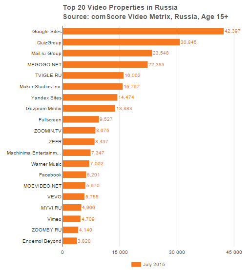 Отметим, что по сравнению с июнем изменилась пятерка лидеров по посещаемости среди платформ для просмотра видео. Google Sites по-прежнему занимают первое место с 42,4 млн пользователей, но на втором месте оказалась компания QuizGroup (30,8 млн пользователей), которая занимается созданием и наполнением брендированных каналов вещателей на YouTube.