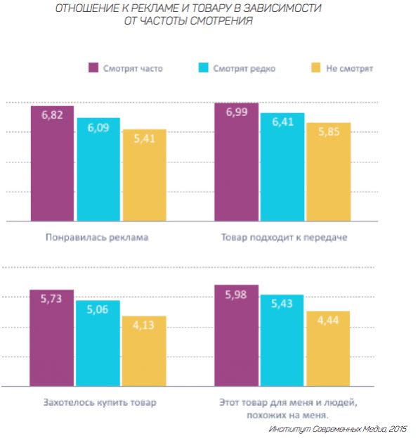 Кроме того, аналитики обнаружили, что чем чаще человек смотрит передачу, тем лучше им воспринимается товар и спонсорская реклама. В лояльной аудитории оценки спонсорской рекламы и товаров выше на 20-40%.