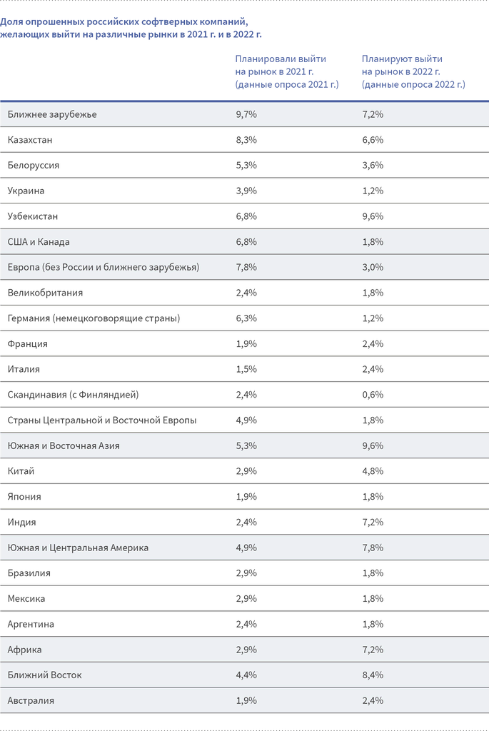 Спрос на российское ПО сохранился, и западные компании закупают его через офисы в нейтральных странах — в Армении, Турции, Казахстане, Черногории, Узбекистане, Грузии и ОАЭ. Однако прямая торговля на европейском или североамериканском рынке по-прежнему остается для российских производителей слишком сложной задачей. Согласно опросу, только 3% опрошенных компаний-разработчиков ПО намеревались выйти на европейский рынок в 2022 году, в прошлом году этот показатель насчитывал 7,8%. Для североамериканского рынка (США и Канада) это число упало более чем в три раза — до 1,8 вместо 6,8%. Надо отметить, что опрос проводился с февраля по конец мая, а значит, не все компании оценивали масштаб негативных последствий, намереваясь вернуться к прежнему сотрудничеству, следовательно, в будущем эти показатели могут упасть до 0.
