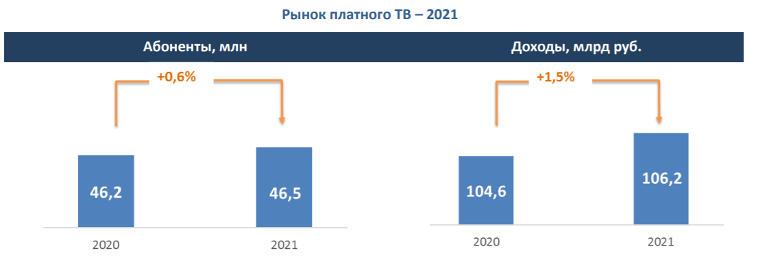 В 2021 году российский рынок платного ТВ практически остановился в своем росте: по оценкам "ТМТ Консалтинг", абонентская база увеличилась всего на 0,6% (против 1,8% в 2020 году) и достигла 46,5 млн. Проникновение услуги составило 82,5%.