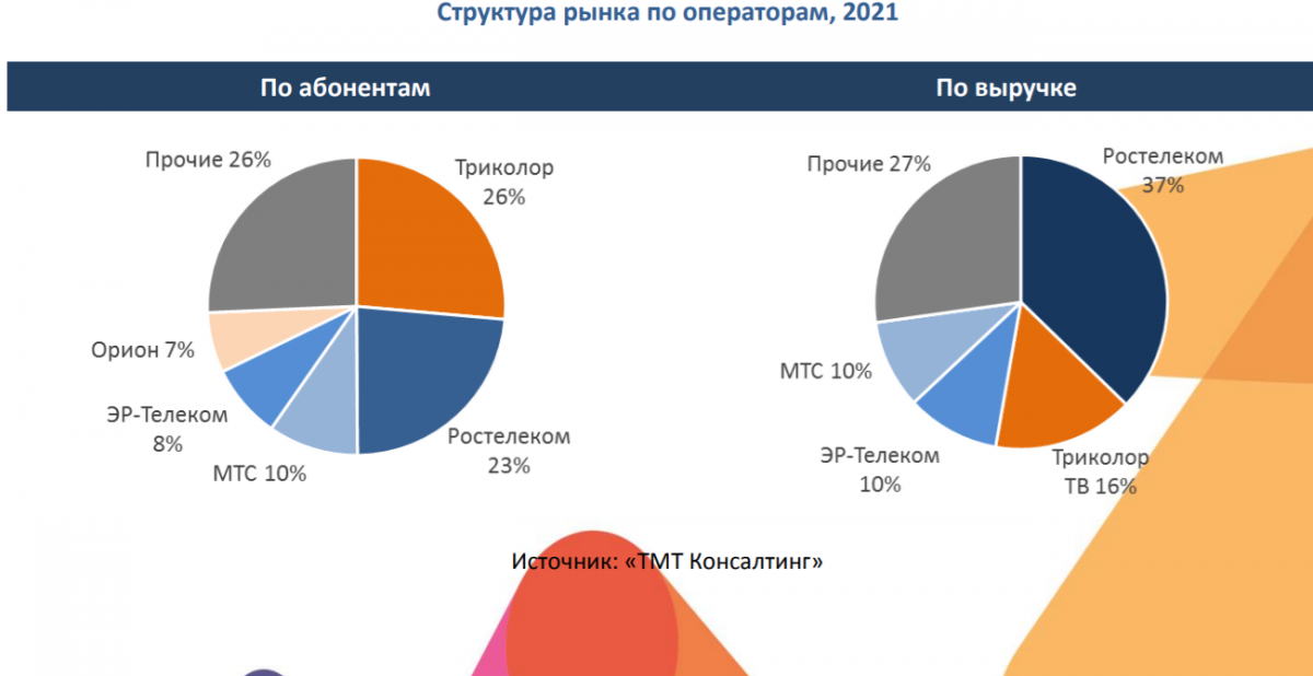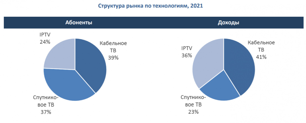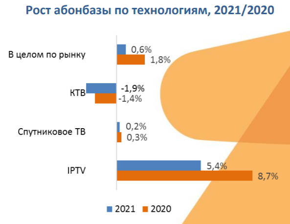 В кабельном ТВ абонентская база сократилась на 360 тыс. Впервые сегмент продемонстрировал отрицательную динамику и в выручке (-0,9%) - этому способствовал отказ многих операторов (в частности, "Ростелекома") от повышения тарифов в 2021 году.