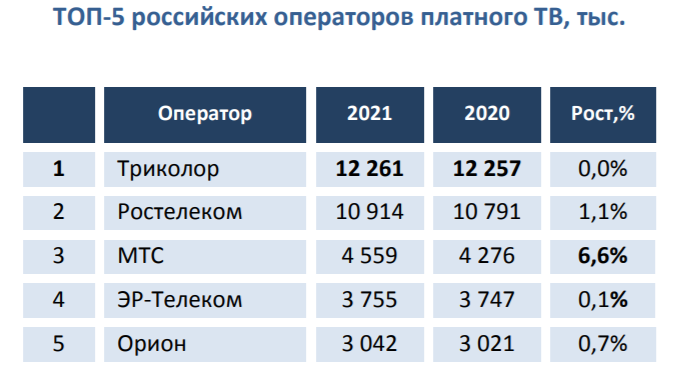 Остальным трем операторам из Топ-5 удалось сохранить положительную динамику (менее 0,1% - 0,7%), при этом прирост оказался незначительным – от 4 до 21 тыс. Все эти игроки придерживаются стратегии развитии услуги платного ТВ в связке с другими цифровыми сервисами – такими, как фиксированный и спутниковый интернет, онлайн-кинотеатр, видеонаблюдение и т. д.