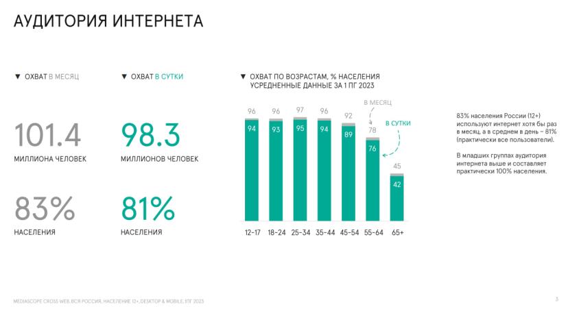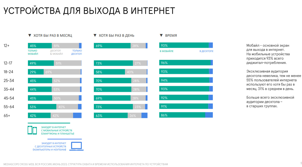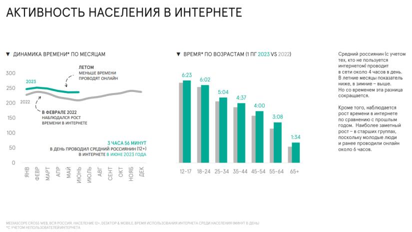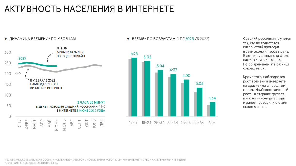 Так, пользователи старше 12 лет в июне 2023 года проводили в интернете 3 часа 56 минут в день, а возрастной категории 12−24 лет показатель достиг порядка 6 часов. Причем 93% граждан выходят в интернет с мобильных устройств. 55% пользователей используют компьютер в этих целях хотя бы раз в месяц, а 31% в среднем пользуется десктопом ежедневно.