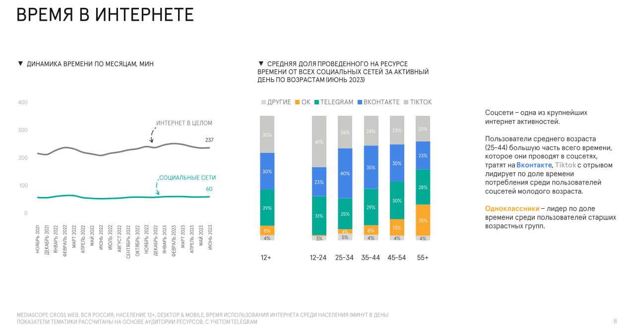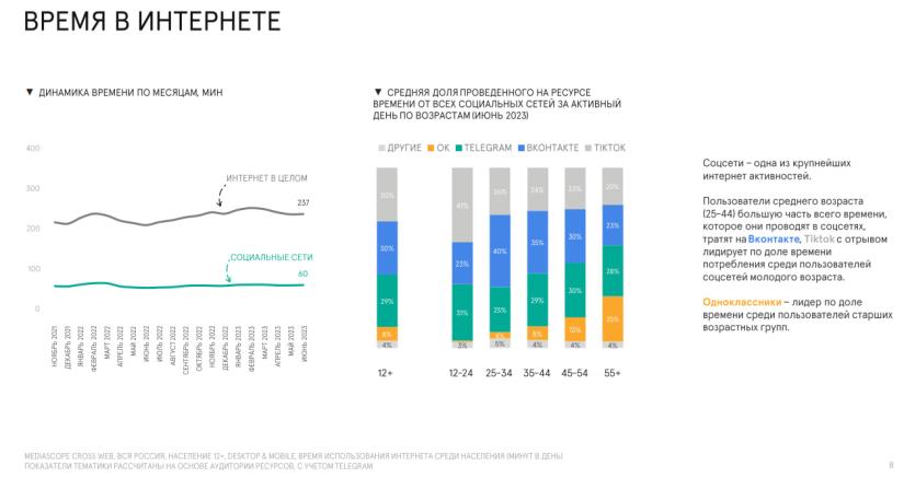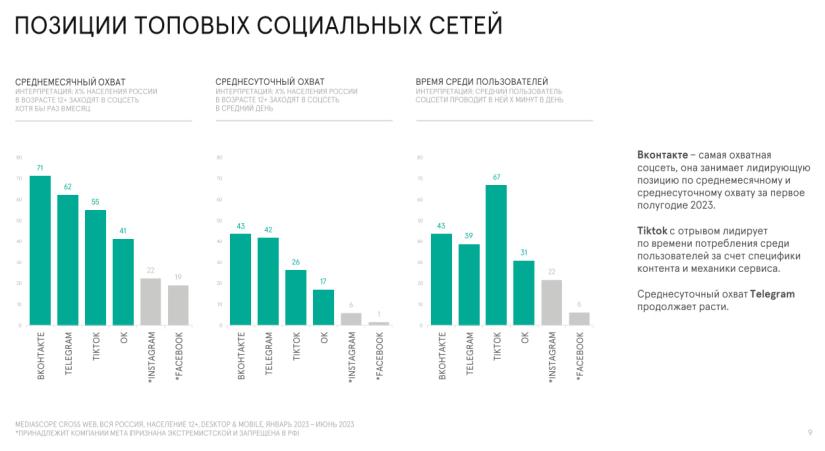 "ВКонтакте" занимает лидирующую позицию по среднемесячному охвату (71% населения страны старше 12 лет заходит хотя бы раз в месяц), и по среднесуточному (43% заходят хотя бы раз в день). У TikTok сразу после введения ограничений в отношении российских пользователей весной 2022 года, охваты и время проведения на платформе снизились. Однако в начале 2023 года количество пользователей вернулось к значениям января-февраля 2022, а время, проведенное на площадке, остается ниже. Так, средний пользователь TikTok проводит 67 минут в день в сервисе.