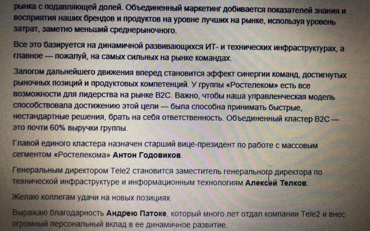Telegram-канал TelecomDog опубликовал текст внутреннего письма компании о грядущих изменениях.