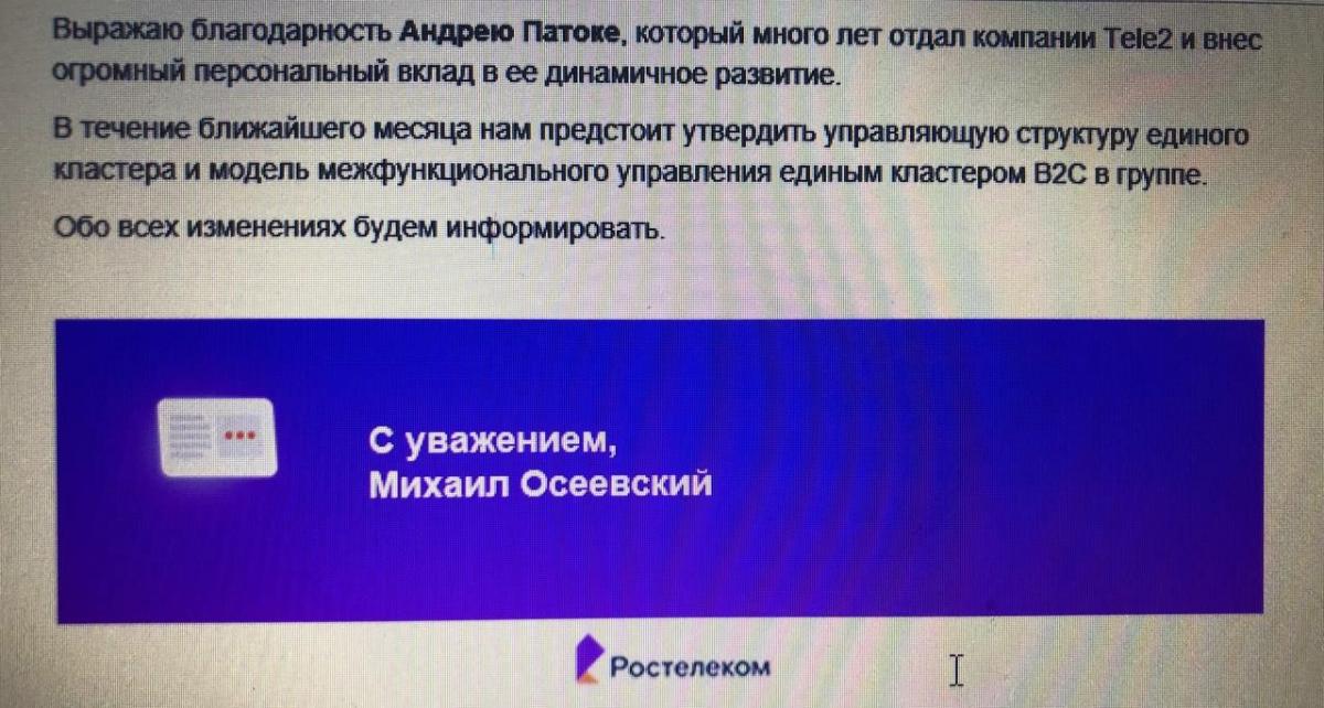 Бывший гендиректор Tele2 Андрей Патока был назначен на эту должность в июне 2021 года. С августа 2016 он работал заместителем гендиректора оператора по продукту, маркетингу и работе с федеральными клиентами. "Выражаю благодарность Андрею Патоке, который много лет отдал компании Tele2 и внес огромный персональный вклад в ее динамичное развитие", — написал во внутреннем письме "Ростелекома" глава компании Михаил Осеевский.