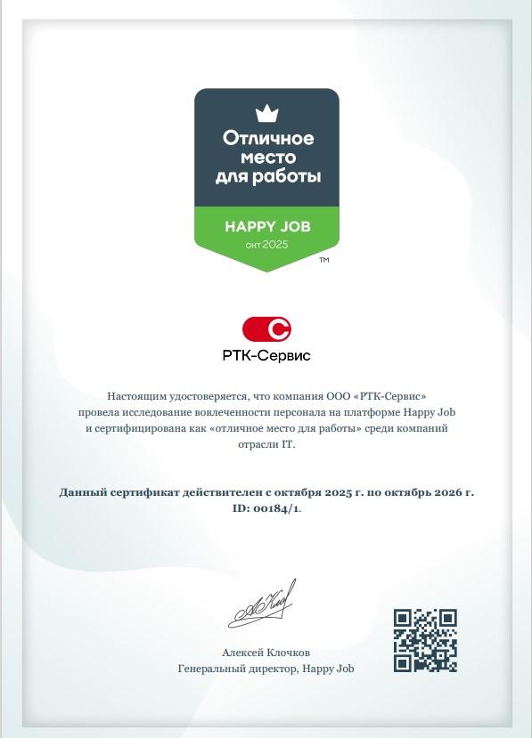 * Сертификат/знак "Отличное место для работы" выдан на основании наилучших показателей вовлеченности и лояльности персонала по итогам опроса сотрудников ООО "РТК-Сервис" на платформе Happy Job (торговый знак ООО "ФЕРСТ ТРЭЙНИНГ ГРУПП") и включения ООО "РТК-Сервис" в список сертифицированных компаний на сайте https://certify. happy-job. ru