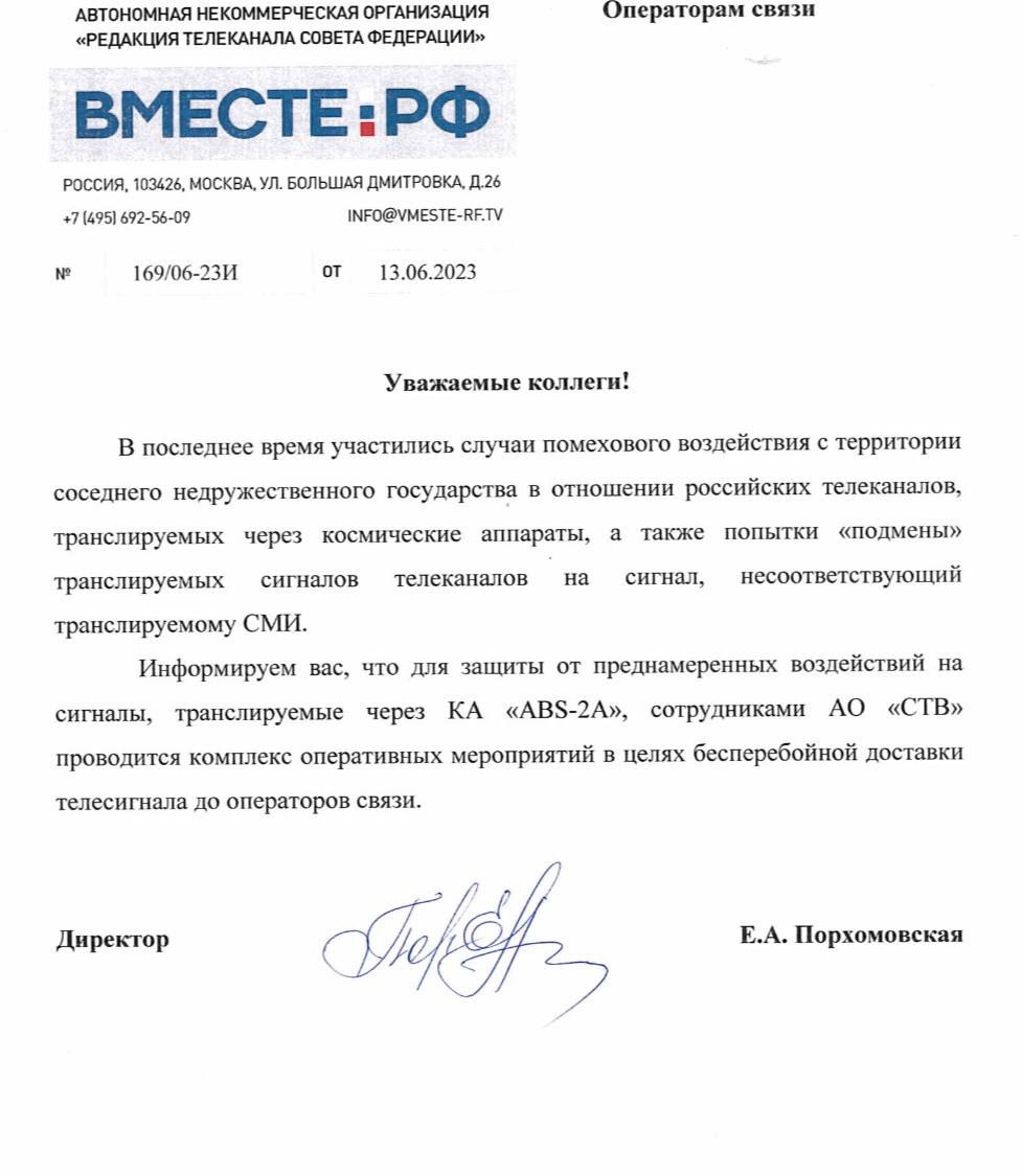 В распоряжении "Кабельщика" также есть письмо телеканала "Вместе.РФ", в котором говорится о попытках подмены сигнала.
