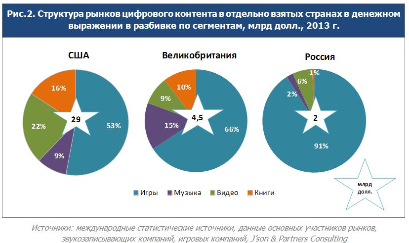 Крупнейшим на мировой арене является рынок цифрового контента США – он составляет 27%, второе место отводится Японии – 14%, Великобритания и Южная Корея занимают по 4% общего рынка, Россия – 2%, по данным за 2013 год.