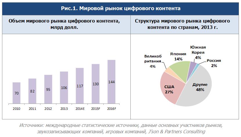 По данным исследователей, мировой рынок цифрового контента в 2013 году составил $106 млрд, что на 12% выше показателя 2012 года. Как ожидается, в 2014-2016 годах рынок будет расти в среднем на 11% в год и достигнет отметки в $144 млрд в 2016 году.
