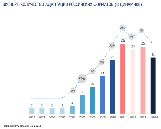 В отчете отмечается, что в прошлом, 2013 году, по 8 российским форматам было произведено 25 адаптаций. Наибольшую активность в покупке российских форматов проявили компании стран СНГ (Украина, Казахстан, Белоруссия, Молдавия, Армения, Грузия) и прибалтийских стран (Литва, Латвия, Эстония). В прошлом году впервые приобрели развлекательные программы и сериалы по российским форматам: Польша, Сербия, Турция.