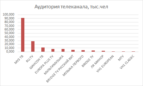 Аудиторию каналов из первой тройки измеритель оценивает, соответственно, в 91,7 тыс., 28,5 тыс. и 11,6 тыс. человек. В пятерку лидеров также попали Europa Plus TV (0,063%, 7,8 тыс. человек) и "Мультимузыка" (0,061%, 7,6 тыс. человек).