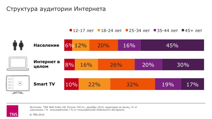 Чаще всего (в 32% случаев) Smart TV пользуются люди в возрасте от 25 до 34 лет. При этом данная аудитория составляет лишь 20% населения РФ. Самая многочисленная (45%) возрастная группа России, а это люди в возрасте от 45 лет и старше, пользуется "умными" телевизорами почти вдвое меньше — в 17% случаев.