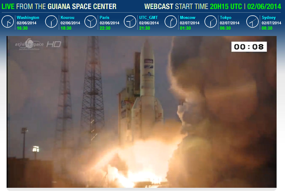 Сегодня ночью с французского космодрома в Куру стартовала ракета-носитель Ariane 5 ECA с двумя телекоммуникационными спутниками на борту — ABS-2 и Athena-Fidus. Запуск космического аппарата был задержан на 1 час и 10 минут из-за погодных условий (в Куру лил дождь), но, тем не менее, в 18.30 по местному времени и в 1:30 по мск запуск все же состоялся и прошел успешно.