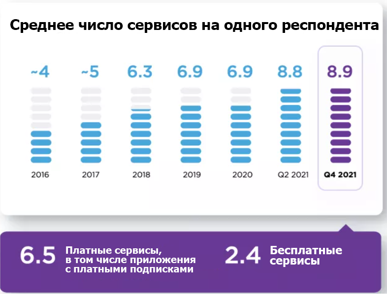 Впрочем, ситуация не то чтобы устраивает население – четверть респондентов заявили, что, вероятно, отменят одну или несколько подписок на SVOD. Среднее количество видеосервисов, которые оплачивает средний американец, достигло 8,8 во II квартале 2021 года, тогда как в конце 2020 года это число составляло 6,9. год. Правда, сюда входят не только платные сервисы, но и приложения TV Everywhere - 2,4 из подключенных сервисов являются бесплатными и поддерживаются рекламой.