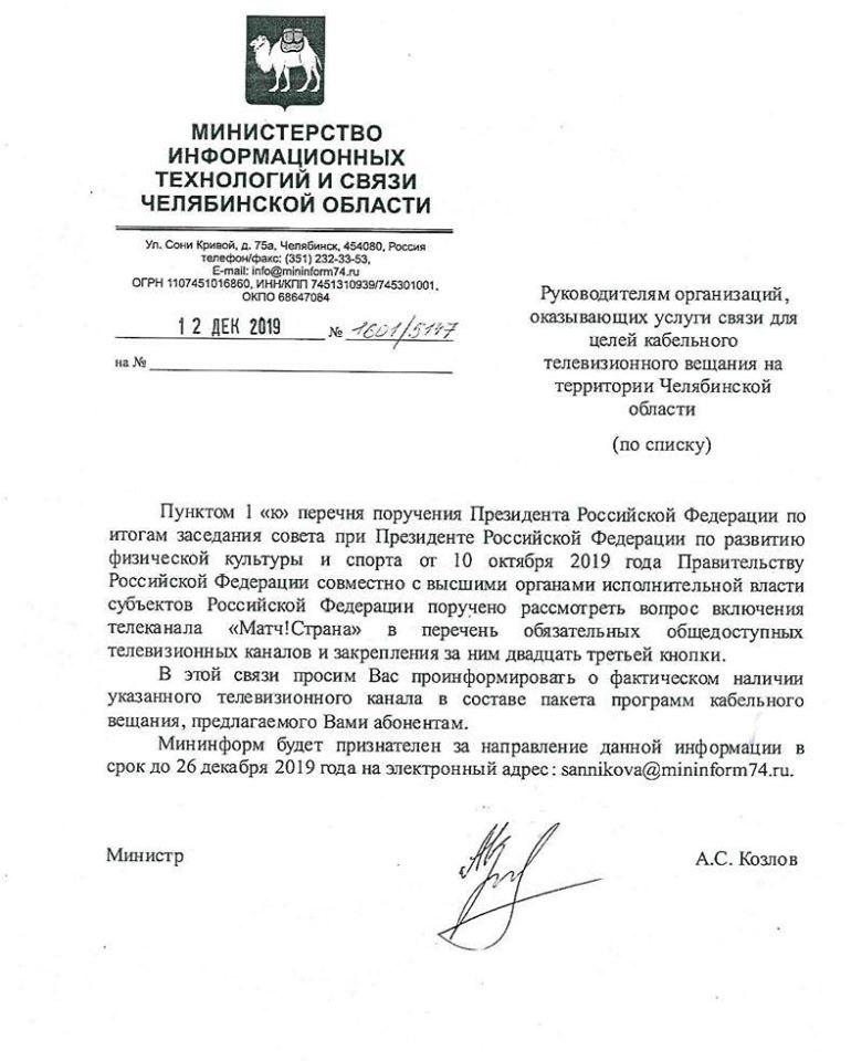 В связи с этим поручением региональные министерства связи направляют местным ТВ-операторам запросы о фактическом наличии этого телеканала в их пакетах. Министерство информационных технологий и связи Челябинской области ожидает получить эту информацию до 26 декабря 2019 года на электронный адрес ведомства.