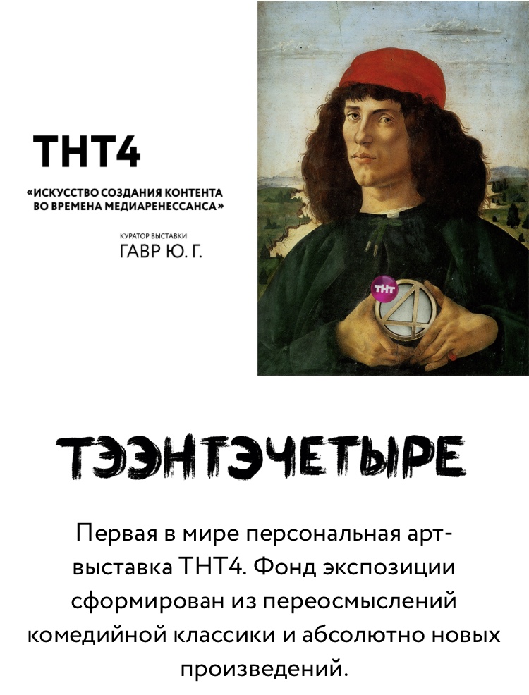 Телеканал ТНТ4 тоже открыл собственный виртуальный музей на своем сайте, сообщает пресс-служба телеканала. Посетить его можно по ссылке: https://art.tnt4.ru.