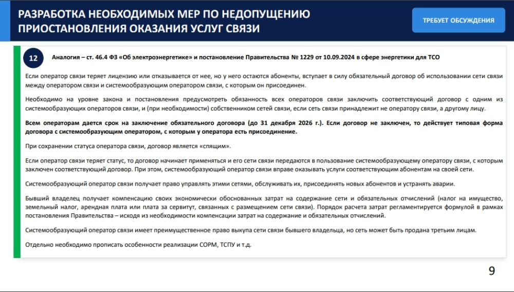 Однако данный документ имеет ряд существенных для телеком-операторов пунктов. Особое внимание привлекла инициатива о введении института "системообразующих операторов", которая в случае принятия проекта наделит крупных игроков полномочиями по поглощению активов компаний, лишившихся лицензии. Согласно документу, при аннулировании лицензии сеть "недобросовестного" оператора не прекратит работу: в силу закона может активироваться "спящий" договор, по которому управление инфраструктурой перейдет к федеральному или государственному игроку.