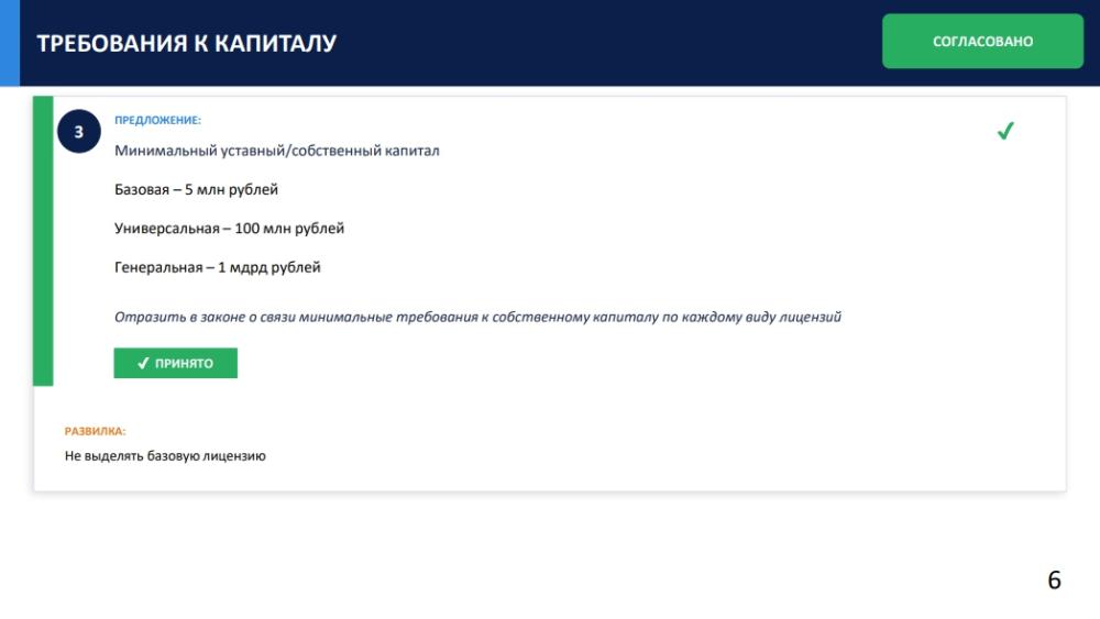 - Новая система лицензирования. Вместо действующей системы предлагается ввести три типа лицензий: базовую (1 млн руб.), универсальную (10 млн руб.) и генеральную (50 млн руб.). Для их получения вводятся высокие требования к капиталу (от 5 млн до 1 млрд рублей).